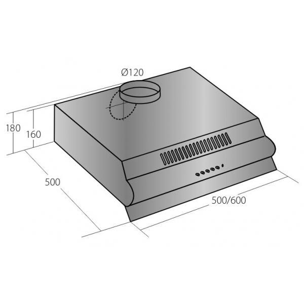 Podskříňková digestoř, šíře 60 cm,nerez, max. výkon 160 m³/h (15 Pa), hlučnost Lw 50 – 61 dB(A), 3 rychlosti, mechanické tlačítkové ovládání, kovové sendvičové tukové filtry, které lze mýt v myčce, možnost práce v odtahovém i recirkulačním režimu, výstupní průměr 120 mm, osvětlení 1 × 4 W LED žárovka E14, Výbava: zdarma zpětná klapka
