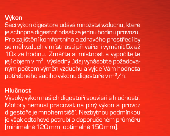 - Maximální výkon 697 m³/h (5 Pa) - hlučnost Lw při max. výkonu je 69 dB(A) - odsávací jednotky mají individuálně vyvažovanou turbínu - motory jsou opatřené vratnými tepelnými pojistkami (při přetížení motoru vypne, po jeho vychladnutí opět sepne) - elektronické ovládání s LED displejem - dálkové ovládání – zdarma dálkový ovladač i s bateriemi - nastavitelný časovač v rozsahu 10 až 60 minut - indikace nutnosti vyčištění tukových filtrů a výměny uhlíkových filtrů - kovové sendvičové tukové filtry, které lze mýt v myčce - výstupní průměr 150 mm – zdarma přiložena redukce 150 mm / 120 mm a zpětná klapka - možnost práce v odtahovém i v recirkulačním režimu
