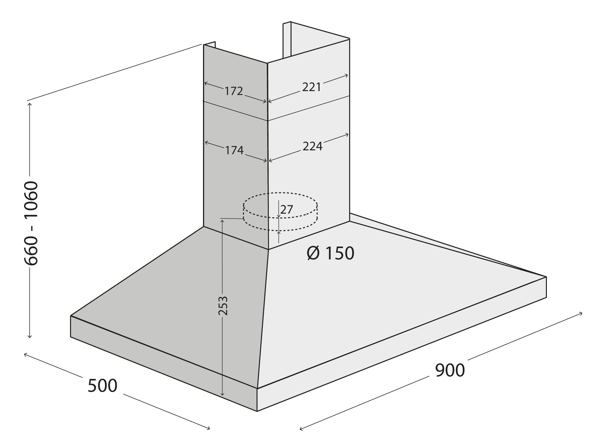 - Výška odsavače je zpravidla udávaná v minimálních a maximálních hodnotách. Dle libosti si můžete uzpůsobit výšku odsavače. V balení jsou k dispozici dvě části komínu, které do sebe zapadají. Vy si můžete tuto výšku nastavit přesně podle svých představ.