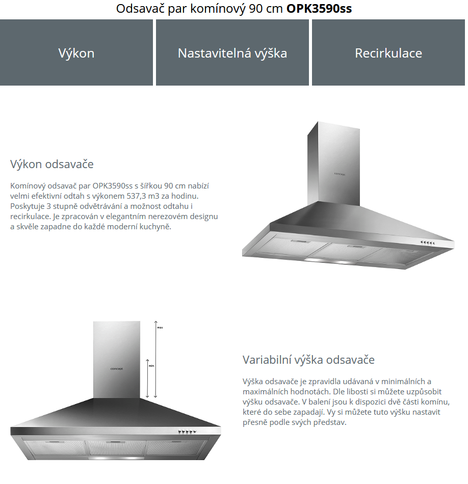 - Komínový odsavač par OPK3590ss s šířkou 90 cm nabízí velmi efektivní odtah s výkonem 537,3 m3 za hodinu. Poskytuje 3 stupně odvětrávání a možnost odtahu i recirkulace. Je zpracován v elegantním nerezovém designu a skvěle zapadne do každé moderní kuchyně.