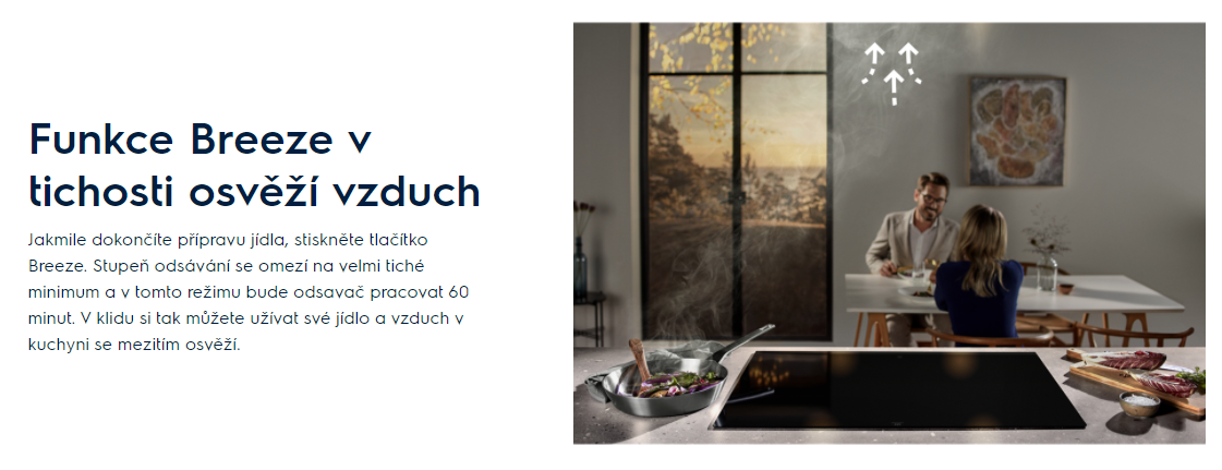 Jakmile dokončíte přípravu jídla, stiskněte tlačítko Breeze. Stupeň odsávání se omezí na velmi tiché minimum a v tomto režimu bude odsavač pracovat 60 minut. V klidu si tak můžete užívat své jídlo a vzduch v kuchyni se mezitím osvěží.