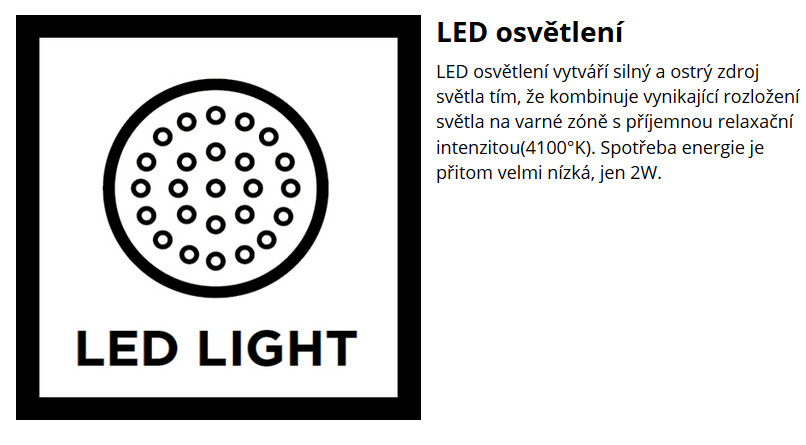 LED osvětlení dokonale rozloží světlo po celé varné zóně s příjemnou intenzitou a velmi nízkou spotřebou.
