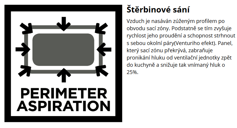 Štěrbinové sání na obvodu sací zóny plně nahrazuje absenci vodorovné části odsavače, toto technické řešení spolu s výkonnou ventilační jednotkou zajišťuje velmi dobrou účinnost přímého zachycení par.