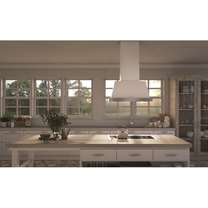 Rustikální ostrůvková digestoř Thea Isola v sobě snoubí vintage styl s moderním designem a nabízí nadčasovou eleganci spojenou se špičkovým výkonem. Odsavač Thea Isola v bílém provedení mat je osazen výkonnou ventilační jednotkou EVO, která zajistí vysokou účinnost při nízké spotřebě energie. Zajímavostí jsou také LED pásky na spodní části digestoře, které dokonale osvětlí pracovní plochu. Foto je pouze ilustrační, v případě recirkulačního provozu je třeba dokoupit instalační sadu (spodní obruba a stropní panel v provedení nerez nebo dub durmast). V případě napojení na odtahové potrubí je třeba dokoupit navíc teleskopický komín.