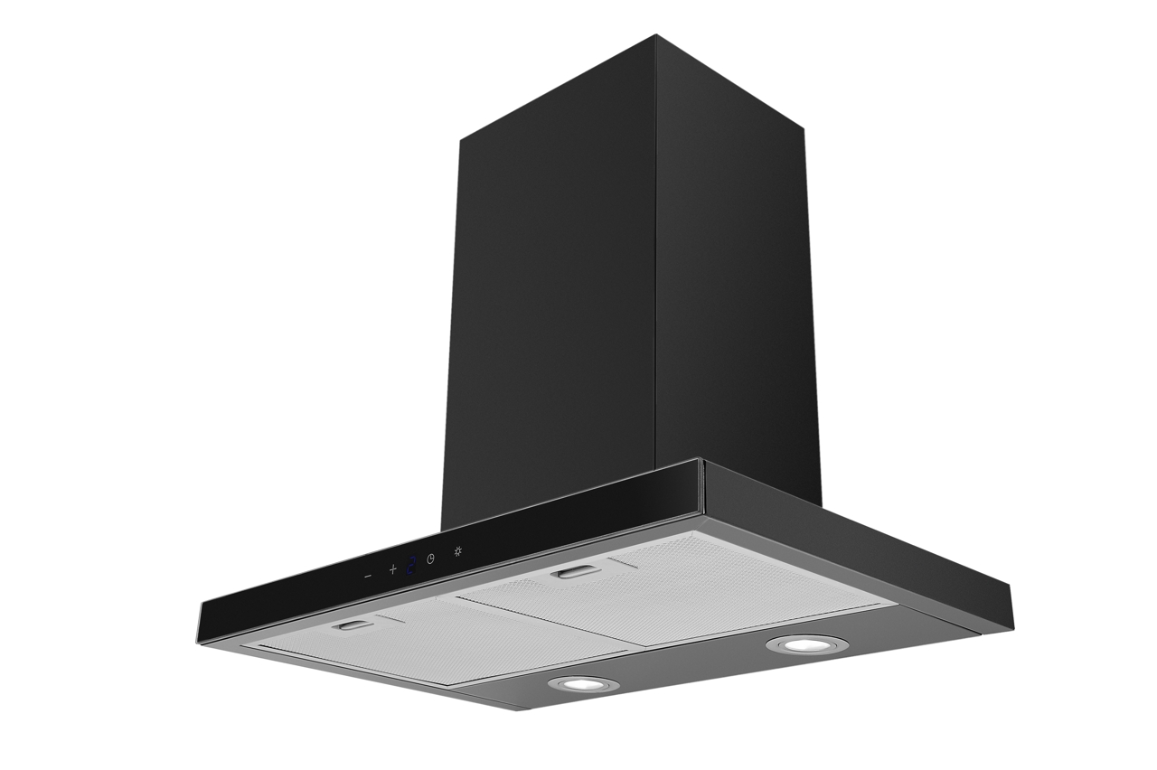 - Elegantní komínový odsavač par ve tvaru T, se skleněným černým panelem