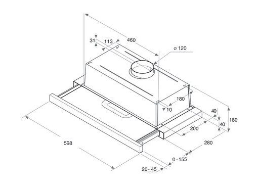 Skrytý "inkognito" odsavač do kompaktní kuchyně. Instaluje se do horní skříňky kuchyňské linky, po zasunutí výsuvné části je viditelná pouze přední nerezová dekorativní lišta.
