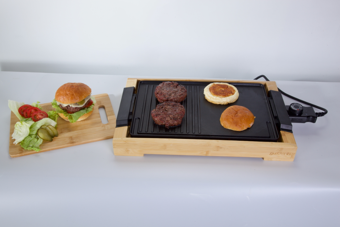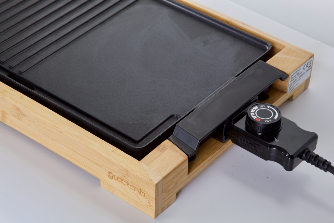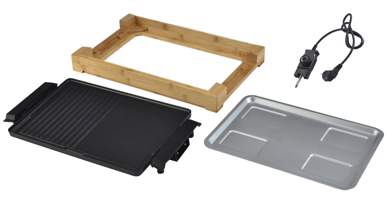 - grilovací deska o rozměru 37,5 x 25 cm je uložena v rámu z bambusového dřeva