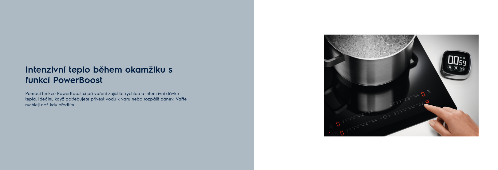Pomocí funkce PowerBoost si při vaření zajistíte rychlou a intenzivní dávku tepla. Ideální, když potřebujete přivést vodu k varu nebo rozpálit pánev. Vařte rychleji než kdy předtím.