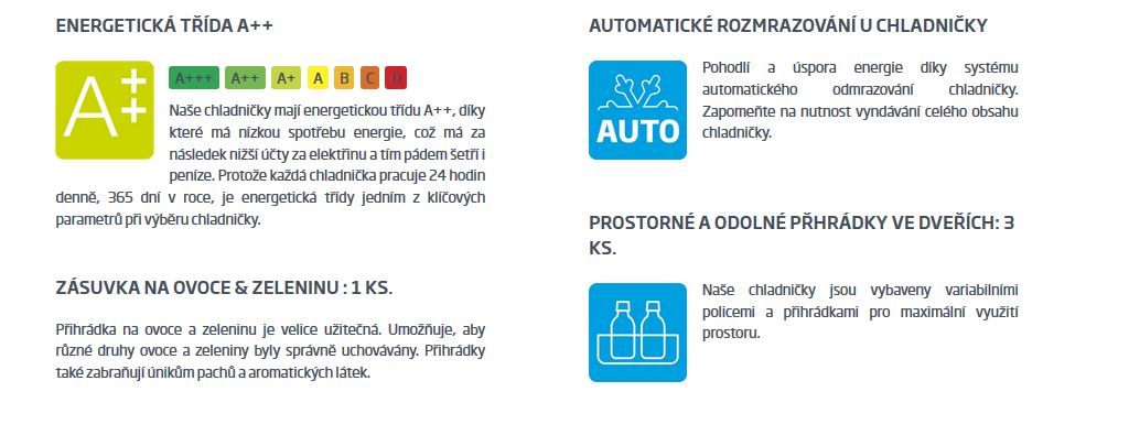 Naše chladničky mají energetickou třídu A++, díky které má nízkou spotřebu energie, což má za následek nižší účty za elektřinu a tím pádem šetří i peníze. Protože každá chladnička pracuje 24 hodin denně, 365 dní v roce, je energetická třídy jedním z klíčových parametrů při výběru chladničky.