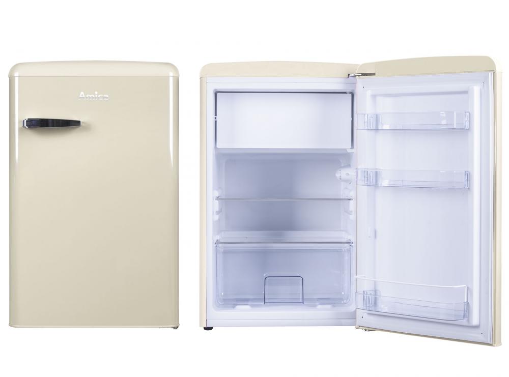 Chladnička retro s mrazničkou, VxŠ: 86x55 cm, A++, 93/13l, 41dB, mechanické ovládání termostatu, LED osvětlení, externí madlo, béžová