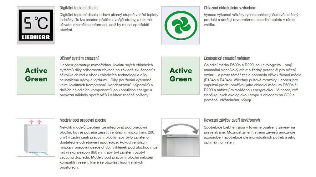 - Chladicí média R600a a R290 jsou ekologická – mají minimální skleníkový efekt a žádný potenciál pro ničení ozónu – a proto téměř zcela nahradila dříve užívaná média (R134a a R404a). Všechny pultové mrazáky Liebherr pro impulzní prodej používají jako chladicí médium R600a či R290 a nabízejí mimořádnou energetickou účinnost, což zlepšuje jejich ekologickou stopu s ohledem na CO2 a pomáhá udržitelnému vývoji.
