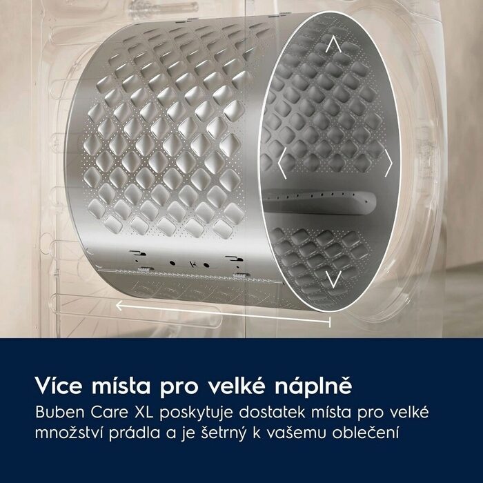 Buben Care XL má dostatečný objem bubnu pro velké dávky prádla i přes standardní rozměr spotřebiče. Buben má vylepšené žebro a vzor připomínající malé polštářky, po kterém oděvy hladce kloužou. Jedinečný vzor bubnu je šetrný k vašemu oblečení.