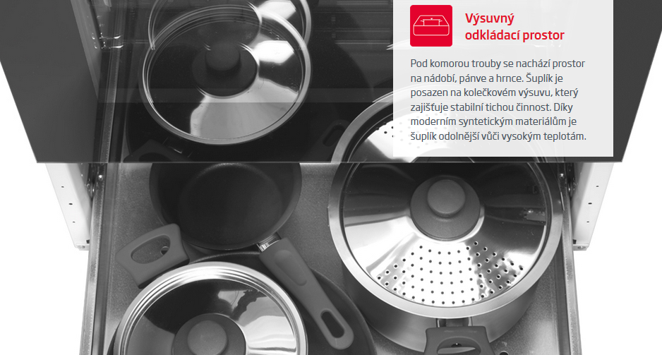 Úložný prostor pod troubou lze díky kolečkům jednoduše vysunout. Je to užitečný prostor na odkládání hrnců, pekáčů či pánví.