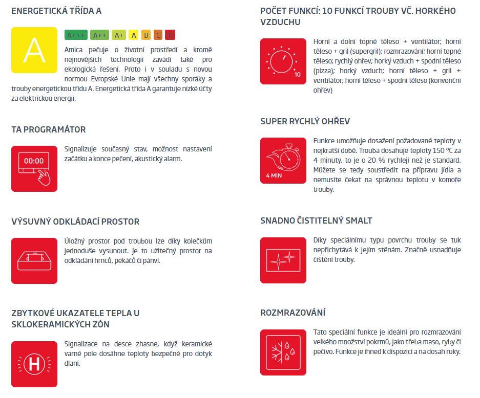 Amica pečuje o životní prostředí a kromě nejnovějších technologií zavádí také pro ekologická řešení. Proto i v souladu s novou normou Evropské Unie mají všechny sporáky a trouby energetickou třídu A. Energetická třída A garantuje nízké účty za elektrickou energii.