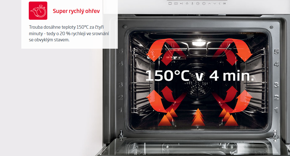 Funkce umožňuje dosažení požadované teploty v nejkratší době. Trouba dosahuje teploty 150 °C za 4 minuty, to je o 20 % rychleji než je standard. Můžete se tedy soustředit na přípravu jídla a nemusíte čekat na správnou teplotu v komoře trouby.