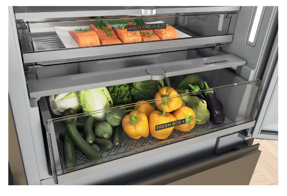 - MultiFresh Box Přizpůsobitelná zásuvka se 3 různými nastaveními teploty pro ideální uložení konkrétních potravin: ryby a maso (+0/2°), ovoce a zelenina (+4°) nebo mléčné výrobky (+2/3°).