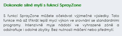 S funkcí SprayZone můžete očekávat výjimečné výsledky. Tato funkce má až třikrát lepší mycí výkon ve srovnání se standardními programy. Intenzivně myje nádobí ve vyhrazené zóně a odstraňuje i odolné zbytky. Bez nutnosti máčení nebo předmytí.