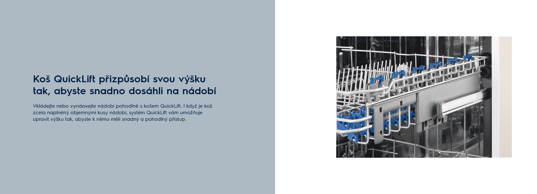 Vkládejte nebo odebírejte nádobí pohodlně s košem QuickLift. I když je horní koš plně naložený, systém QuickLift umožňuje rychlé zvednutí nebo spuštění koše, aby se do něj vešlo nádobí a kuchyňské náčiní různých tvarů a velikostí.