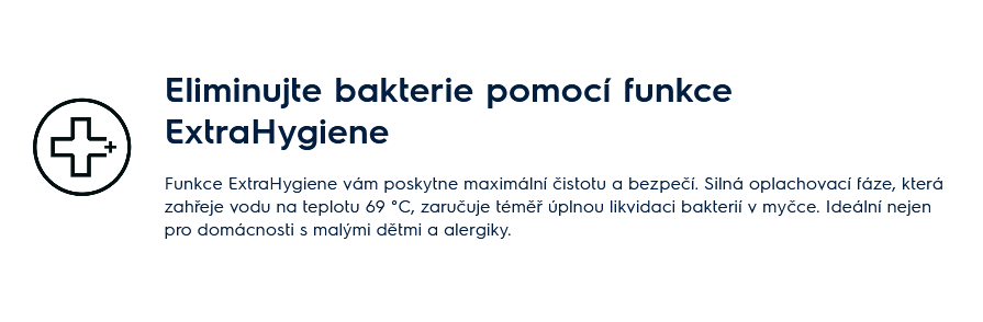 Program Extra Hygiena certifikovaný předním světovým testovacím institutem Swissatest je vysoce účinný mycí cyklus, který odstraňuje více než 99,9999 % bakterií a virů.* Zahrnuje výkonnou sanitační fázi oplachu, při níž se teplota myčky zahřeje na 69 °C. To zaručuje téměř úplné zničení bakterií na vašem nádobí.