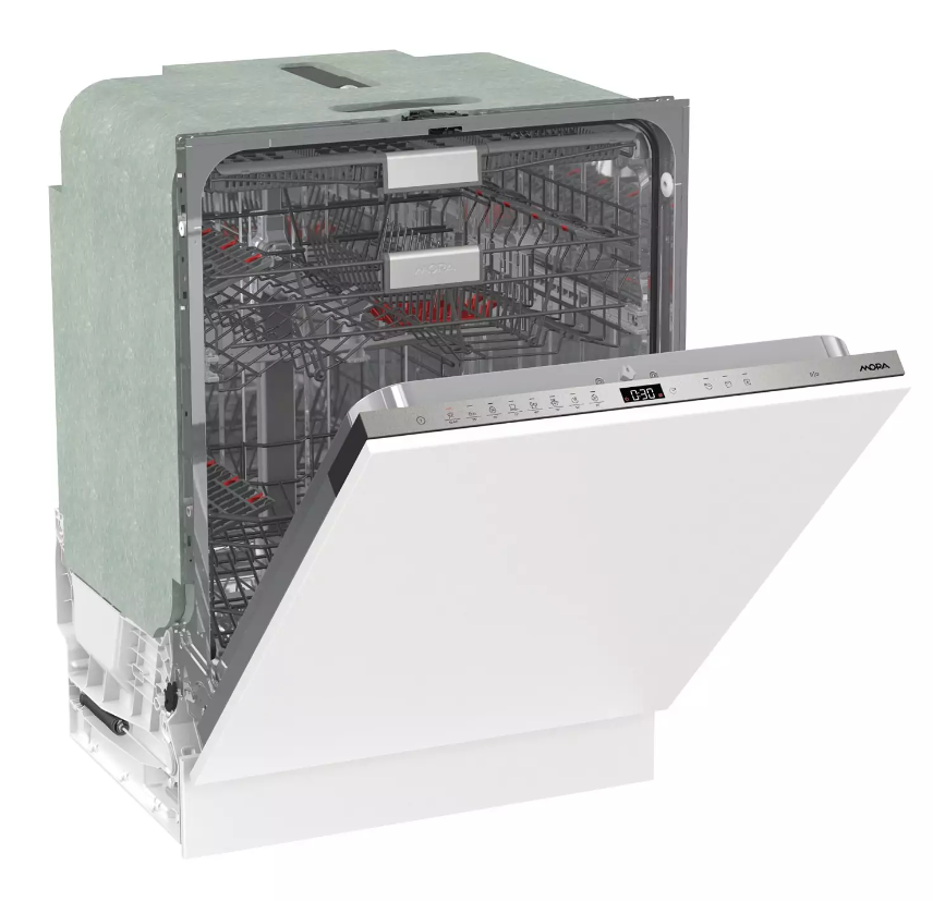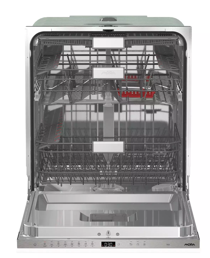 Vestavná plně integrovaná myčka MORA IMB 6686 v úsporné energetické třídě B si při standardní šířce 60 cm poradí s neuvěřitelnými 16 sadami nádobí. Nádobí dokonale umyje díky třem ostřikovacím ramenům a pěti výškovým úrovním proudu vody, takže bude bezvadně čisté, i když bude myčka opravdu plná a nádobí bude hustě naskládané. Je vybavená třemi koši s pohyblivými prvky a přizpůsobitelným nastavením. Vodící lišty v horním koši jsou navíc opatřeny kuličkovými ložisky. Horní koš slouží pro pečlivé a šetrné mytí příborů a kuchyňského náčiní, levý a pravý panel můžete posouvat podle toho, jak velký prostor v horním koši potřebujete. V horním a spodním koši najdete prostor i pro vyšší skleničky na víno. Speciální pryžový materiál je udrží v pevné poloze. Tyto držáky jsou flexibilní a dělitelné, s vyhrazeným prostorem pro různý počet sklenic, aby vyhovovaly vašim potřebám. Skrytý ovládací panel je opatřen dotykovým ovládáním s displejem a mnoha praktickými funkcemi, jako je například RychléMytí, které umožňuje zkrátit délku vybraných programů. Zvolíte-li funkci SušeníPlus, po ukončení programu se automaticky pootevřou dvířka, aby tak unikla pára a následný sušicí cyklus byl efektivnější a energeticky úsporný. Energii pomáhá šetřit i možnost připojení přímo na teplou vodu pomocí speciální hadice, odolávající vysokým teplotám. Samozřejmostí je úsporný ECO Program nebo AUTO Program, který sám zvolí optimální parametry mytí. Vhod přijde i odložený start až o 24 hodin. Myčka má navíc praktický samočistící filtr, a tak automaticky odstraní zbytky mastnoty a jídla ve filtru a zamezí nesprávnému chodu spotřebiče. Se systémem AquaStop se nemusíte obávat nemilého překvapení v podobě vytopení. Myčka je osazená novým výkonným invertorovým motorem a je velmi tichá (42 dB). Dokonce se i sama vyčistí – stačí jednou za měsíc pustit automatický program čiťtění, který vyčistí vanu, ostřikovací ramena i trysky.