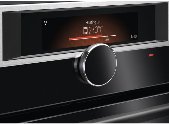 Otočný ovladač vám umožňuje maximální kontrolu nad procesem vaření, nastavením času, teploty i funkcí trouby. Aktuální nastavení se pouhým dotykem okamžitě zobrazí na barevném LCD displeji.