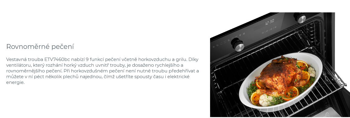- Vestavná trouba ETV7460bc poskytuje velký vnitřní prostor o objemu 70 l, takže v ní pohodlně připravíte i větší množství pokrmů najednou. Uvnitř naleznete 5 zásuvných úrovní pro umístění roštu a plechů.