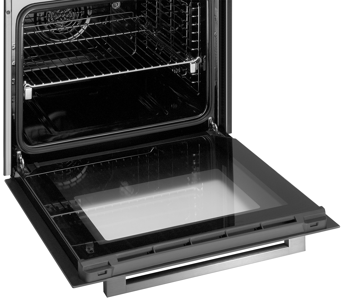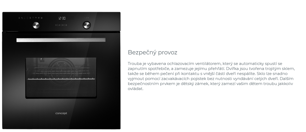 - Trouba je vybavena ochlazovacím ventilátorem, který se automaticky spustí se zapnutím spotřebiče, a zamezuje jejímu přehřátí. Dvířka jsou tvořena trojitým sklem, takže se během pečení při kontaktu s vnější částí dveří nespálíte. Sklo lze snadno vyjmout pomocí zacvakávacích pojistek bez nutnosti vyndávání celých dveří. Dalším bezpečnostním prvkem je dětský zámek, který zamezí vašim dětem troubu jakkoliv ovládat.
