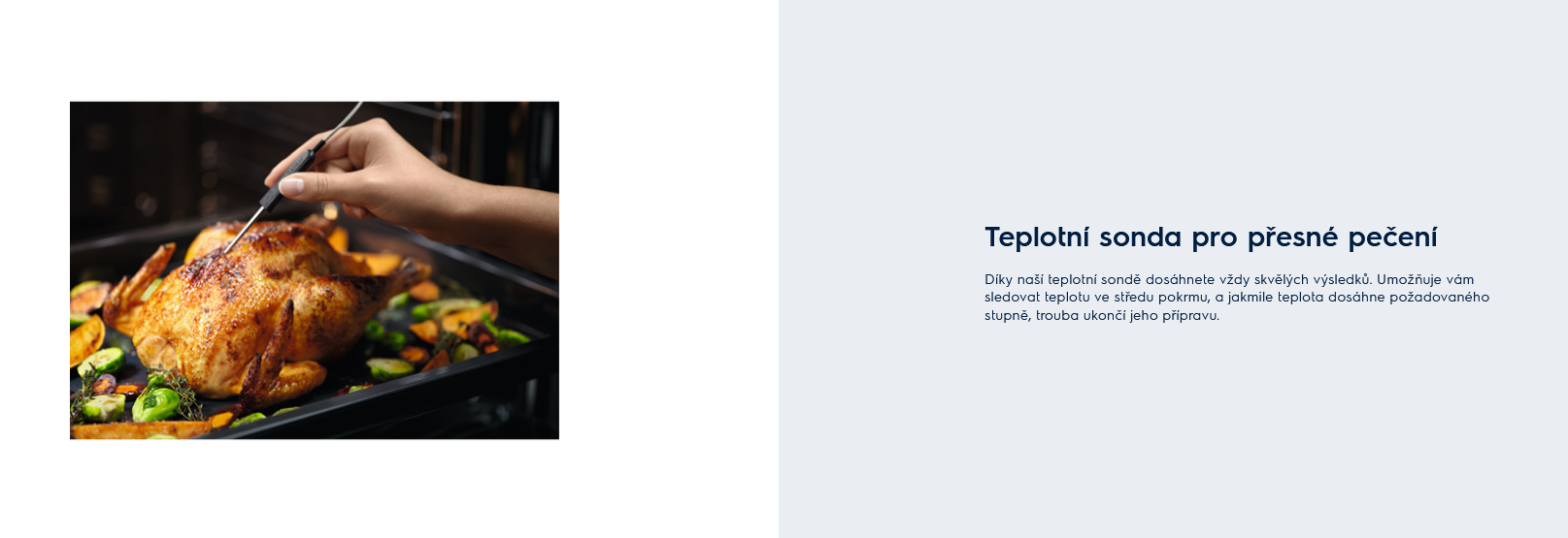 Díky naší teplotní sondě dosáhnete vždy skvělých výsledků. Umožňuje vám sledovat teplotu ve středu pokrmu, a jakmile teplota dosáhne požadovaného stupně, trouba ukončí jeho přípravu.